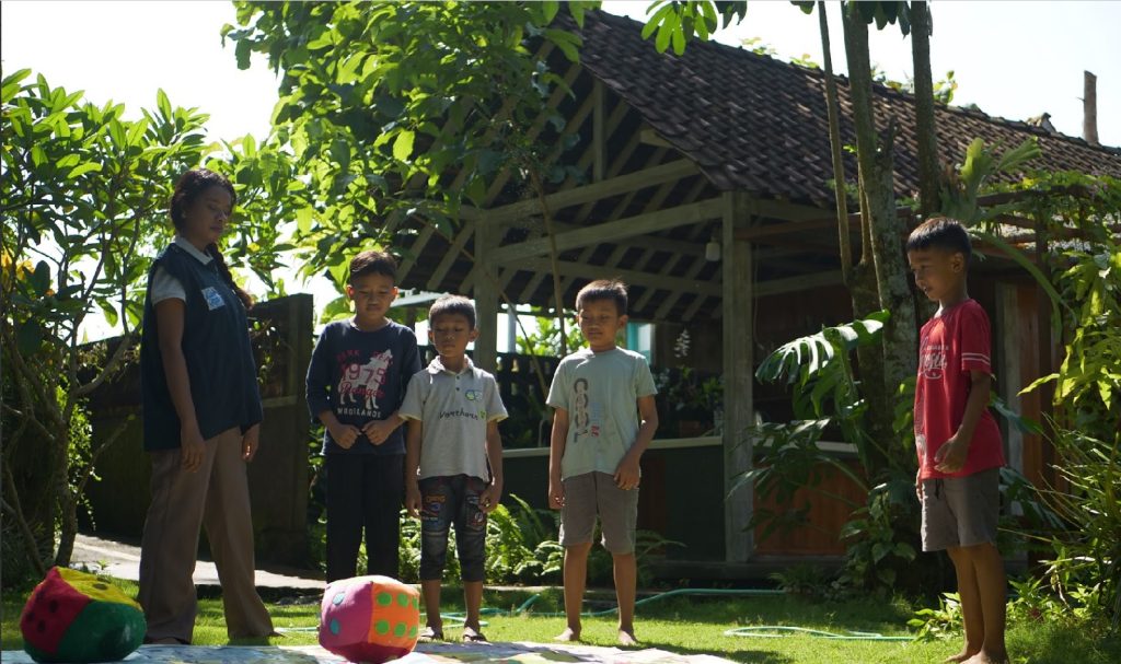 Permainan engklek dan damdaman mengajak anak-anak bergerak lebih aktif. Tubuh mereka melompat, berlari, dan menyeimbangkan diri, sementara suara sorakan teman-teman menjadi penyemangat alami. Permainan ini tidak hanya melatih koordinasi dan ketangkasan, tetapi juga menumbuhkan rasa kebersamaan—bahwa bermain bukan soal menang sendiri, melainkan tentang hadir dan bergerak bersama. Di sudut yang lebih tenang, mainan kecil yang difasilitasi Mutia menjadi ruang eksplorasi imajinasi. Anak-anak bebas mencipta cerita versinya sendiri, menyusun, membongkar, lalu menyusun kembali, seolah dunia kecil itu adalah milik mereka sepenuhnya.